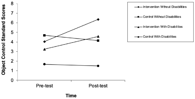 Regarding groups, the post-hoc tests showed significant higher scores for intervention with disabilities at pre-test, p = 0.04 (M = 3.25, SD = 2.30) and post-test, p ≤ 0.001 (M = 4.58, SD = 1.88) compared to the control with disabilities (pre-test: M = 1.67, SD = 1.07; post-test: M = 1.50, SD = 0.80). Furthermore, at the pre-test there was no significant difference between the intervention without disabilities (M = 4.04, SD = 2.20) and the control without disabilities (M = 4.69, SD=1.89) groups (p = 0.26); at the pos-test the intervention without disabilities group (M=6.35, SD=1.77) demonstrated significant higher scores (p ≤ 0.001) compared with the control without disabilities group (M = 4.14, SD = 1.86). Graphic 2 present the object control scores by groups from preto post-tests.