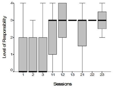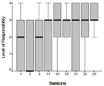 Descriptive analysis indicates that personal and social responsibility levels increased from sessions 1 to 11. From session 12 to session 23, stability in the frequencies was observed. From the initial to the final sessions, especially in session 23, the variability of the behaviors decreased with time. The result indicated significant increases along with the intervention in children’s personal and social responsibility, χ2 = 81.21, p ≤ 0.001. The post-hoc test revealed significant changes from the initial to the intermediate sessions, from the initial to the final sessions, and from one intermediate (number 11) to the final sessions. Higher levels of personal and social responsibility were observed from the initial to intermediate sessions period, and these changes stabilized at higher levels from session 11 to the final sessions, confirming the hypotheses of the present study.
