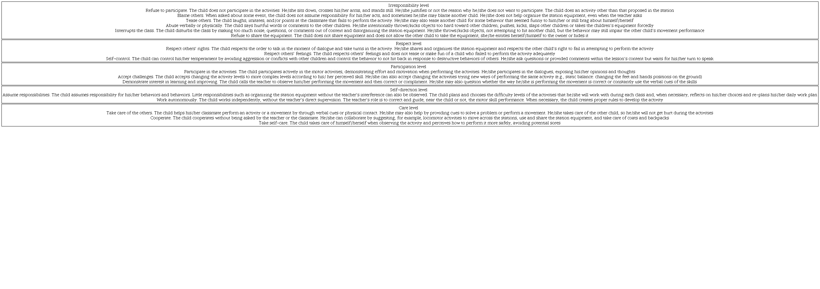 In addition, two strategies for fostering personal and social responsibility behaviors were used: “Awareness talk” and “Group meeting” (Hellison & Cutforth, 2000; Hellison, 2003; 2011). In the awareness strategy teacher used examples (e.g., using billboards, drawings, books, and child’s share experience) of behaviors adequate to a social acquaintance and prompted children to think about them and privately self-evaluate their behavior (Hellison, 2003; 2011). In a “Group meeting” strategy, children were given the opportunity to express their feelings about the session and their behaviors and evaluate group participation in the lesson (Hellison, 2003; Hellison & Cutforth, 2000; Hellison, 2011). At the end of the practice, the instructor read books to children, which approached contents regarding responsibility, respect, politeness (Moses & Gordon, 1998), health, cooperation, attention, and generosity (Llewellyn & Gordon, 2005).
