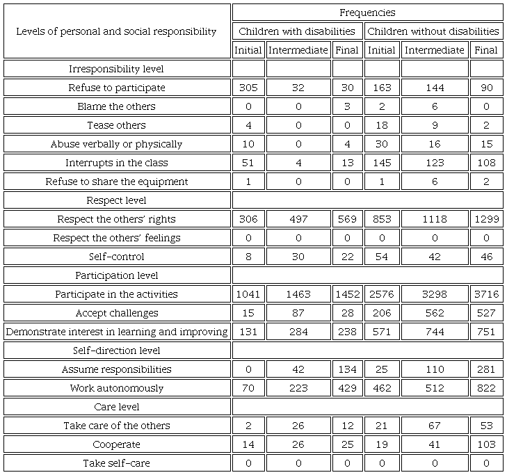 Significant increases in changes in frequencies of personal and social responsibility were found along with the intervention period for children with disabilities (χ2 = 34.61, p ≤ 0.001) and without disabilities (χ2= 51.45, p ≤ 0.001). The post hoc test revealed that significant increases were observed from initial to intermediate sessions and from initial to final sessions. Children with and without disabilities changed from initial behaviors of non-participation to actively participating in the activities and from respecting others to evident interest in learning and practice with autonomy in the intermediate and final sessions. Both groups demonstrated positive and significant changes from the initial to intermediate sessions, and these changes stabilized at higher personal and social responsibility levels from session 11 to the end of the intervention. Table 2 presents the frequencies of personal and social responsibility behaviors on the five levels of social development for children with and without disabilities.