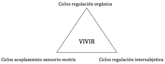 Cada una de estos es fácil de entender, pues refieren a tres dimensiones articuladas del vivir, es decir, las dinámicas metabólicas y moleculares (autopoiesis); los despliegues comportamentales que cada uno y una desenvuelve y que permiten adecuarse a las condiciones del entorno; y, finalmente, los procesos que involucran la emergencia, presencia y cambio de otros y otras en el devenir. Cada uno de ellos si bien se pueden caracterizar, por separado, como categorías de actuación y estructura, ninguno puede considerarse en la experiencia por sí misma; más bien al contrario, se entienden y despliegan en profunda relación entre ellos, y conforman una pirámide de tres lados que, en su conjunción, generan la base (vivir).