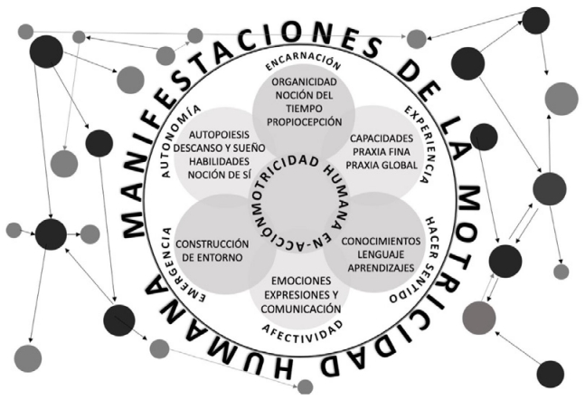 El enfoque enactivo (Varela et al., 2017) del conocer humano, cuyos orígenes se pueden apreciar en la biología del conocer (Maturana y Varela, 1984), abona y operacionaliza perspectivas que dialogan, a nuestro entender, muy fluidamente con las cosmovisiones de las culturas originarias. La enacción como enfoque se caracteriza por reconocer y reponer la experiencia como eje fundante y constitutivo del conocer, y operacionaliza las características invariantes de los seres vivos, en especial los mamíferos. Lo fundamental de este enfoque es que parte del hecho de que todo conocer es producto de las condiciones estructurales y dinámicas de quien conoce, es lo que llamamos, encarnación; es decir, la acción emprendida o motricidad se define desde las capacidades perceptivo-estructurales y de relación de un ser vivo en su medio ambiente (Varela et al., 2017; Gallagher, 2020), que, de acuerdo con las propiedades estructurales y su dinámica, posibilitan la capacidad y condición de sentir y sentirse en cada acción que se emprende y desde allí distinguir y distinguirse.