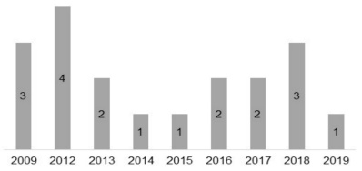 En 2013, 2016 y 2017 se publicaron dos estudios en cada periodo; y en 2014 y 2015, uno.