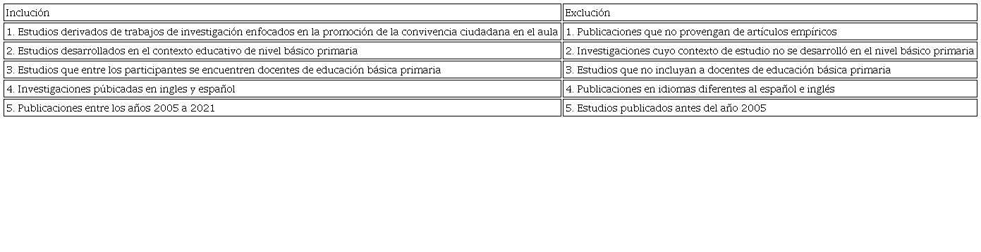 Los estudios empíricos seleccionados fueron los que se desarrollaron en el contexto de educación primaria. Respecto al tema de estudio, debía vincularse con las prácticas educativas o con los significados que el docente relaciona con la convivencia ciudadana. Asimismo, en el diseño de investigación consideramos artículos tanto cualitativos como cuantitativos. De igual forma, el periodo de publicación de las investigaciones aceptadas fue de 2005 a 2021.