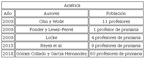Por último, en la investigación realizada en África por Mhlauli (2012) participaron 11 profesores y en el estudio desarrollado en Australia por Peterson y Bentley (2016), cuatro profesores y cuatro líderes escolares.