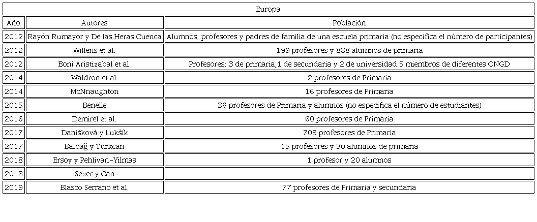 Respecto a los estudios desarrollados en Europa, hay variación en cuanto a los participantes, pues algunos contaron con docentes de otros niveles escolares, incluso en ciertos trabajos intervinieron alumnos y padres de familia.