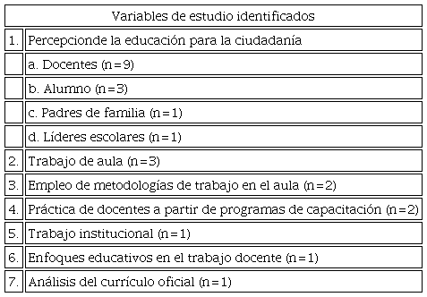 El paradigma de investigación cualitativo predominó en los estudios; la mayoría de las investigaciones se centraron en estudiar la percepción de los docentes. Los estudios cuantitativos abordaron aspectos concretos de la educación ciudadana.