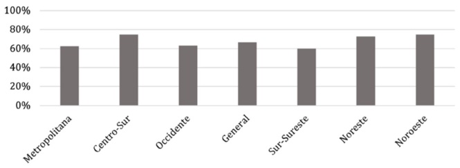 El análisis a las limitaciones de infraestructura y conectividad para la operación de Aprende en Casa por regiones mostró un mayor impacto significativo en el sur-sureste, que incluye estados como Chiapas, Oaxaca y Guerrero, que, de acuerdo con el Coneval (2021), son las entidades con menor nivel de acceso a los dispositivos y servicios señalados. En nuestro análisis encontramos que, en todas las regiones, estas limitaciones fueron las más importantes y representaron en todas ellas al menos el 60% de las menciones (véase gráfica 2).