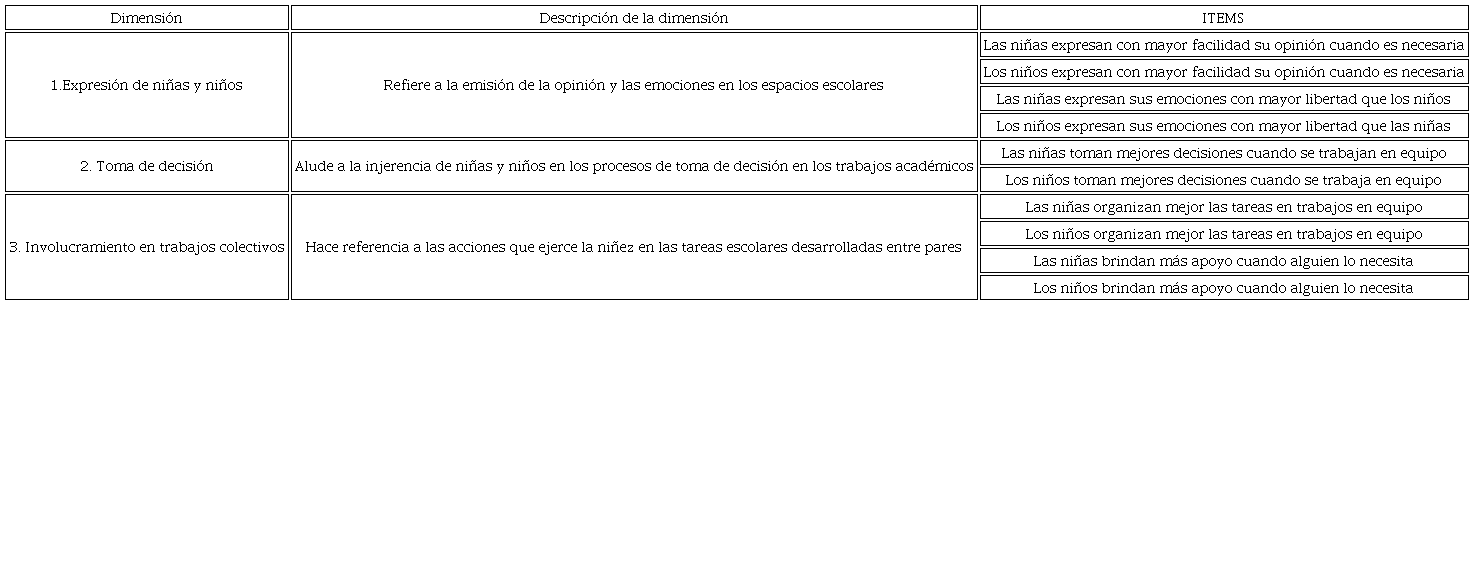 Seleccionamos el instrumento sobre la expresión de estereotipos de género en estudiantes de educación primaria validado por Romero y Cardeña (2017), el cual es un cuestionario tipo Likert de cuatro opciones que indagan los estereotipos de género que se manifiestan en el espacio escolar con niñas y niños de educación primaria en México. A partir de la estructura de las preguntas del instrumento, adaptamos las dimensiones y los ítems a los intereses del estudio en torno al ejercicio de la participación de niñas y niños en el ámbito escolar; el instrumento fue evaluado por medio del juicio de expertos. En la tabla 1 se muestra dicha estructura.