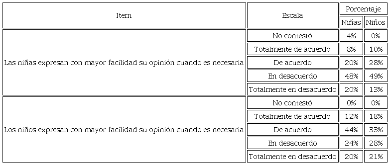 En la anterior tabla observamos que la población encuestada coincide en que las niñas se perciben con menor facilidad para expresarse que los niños (48% de mujeres y 49% de hombres). Esta información corrobora que las niñas están totalmente de acuerdo (12%) o de acuerdo (44%) que los niños son quienes tienen mayor facilidad. Esto, en contraste con los niños, quienes se posicionan a sí mismos con facilidades para expresarse (18% totalmente de acuerdo y 33% de acuerdo). Con base en estos datos, las niñas presentan barreras para emitir su punto de vista que dificultan que puedan usar su palabra para exponer abusos, omisiones, preferencias o ser tomadas en cuenta en los procesos de toma de decisión.