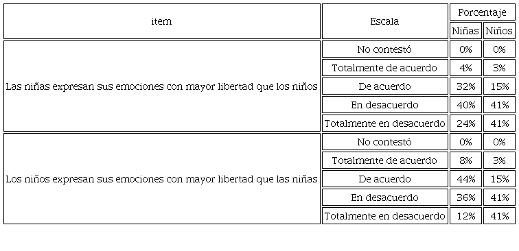 Respecto a la libertad en la expresión de emociones, en la tabla 3 advertimos que las niñas de nuevo se identifican con limitaciones para expresar sus emociones (40% en desacuerdo y 24% totalmente en desacuerdo que lo hacen con mayor libertad que los niños). En tanto, sus compañeros varones se conciben a sí mismos con menor libertad que las niñas (41% totalmente de acuerdo y 41% de acuerdo).