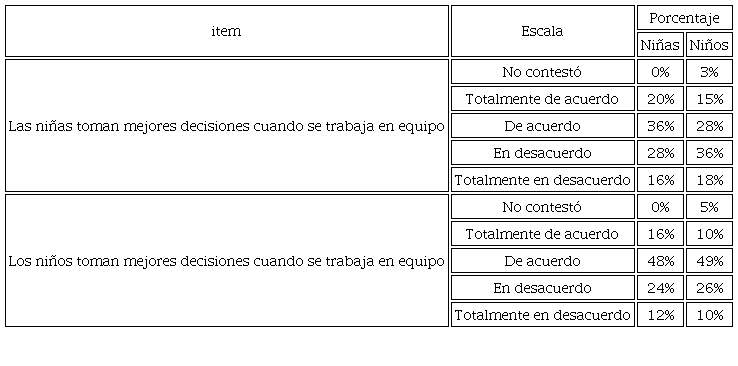 Esta surge por la necesidad de consensuar un acuerdo para realizar los trabajos académicos, de tal forma que el trabajo en equipo es una actividad preponderante para emitir una postura ante una actividad escolar. La tabla 4 muestra que el 54% de los niños (36% en desacuerdo y 18% totalmente en desacuerdo) no están de acuerdo en que las niñas tomen mejor las decisiones en los trabajos en equipo. Esta situación se reafirma cuando niñas y niños destacan que sus compañeros hombres toman mejores decisiones cuando trabajan en equipo (48% de niños en acuerdo y 49% de las niñas).