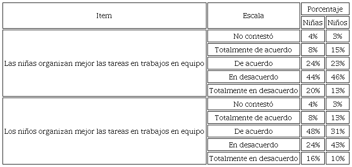 En cuanto a la toma de decisión, en la tabla 4 se muestra un consenso entre niñas y niños que las mujeres no organizan adecuadamente las asignaciones del trabajo en equipo. Esta situación contiene de forma implícita que el ejercicio del liderazgo no está asociado a una característica de lo feminino. Las creencias de que las niñas son menos capaces para organizarse y tomar decisiones respecto a sus compañeros hombres son estereotipos que atentan contra la igualdad.