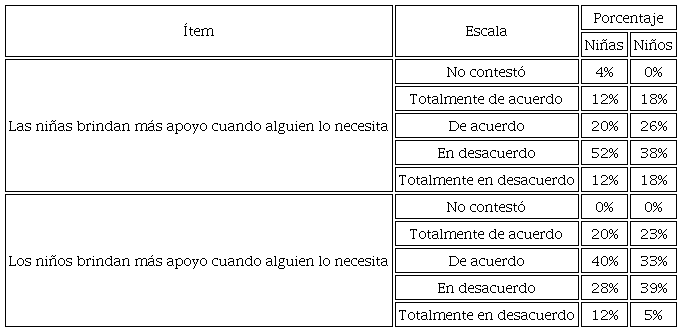 El apoyo conforma otro aspecto de esta dimensión. En la tabla 6 observamos que poco más del 30% de las niñas se perciben a sí mismas como personas que suelen apoyar a los demás cuando lo necesitan (12% totalmente de acuerdo y 20% de acuerdo); de igual forma, el 60% de las niñas posicionan a los niños con más capacidad para apoyar a otros (20% totalmente de acuerdo y 40% de acuerdo).