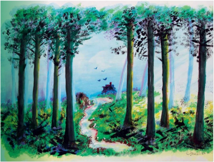 Tal como dice el texto, Di Pascua -quien, además de escribir, es ilustradora- acercó al taller una serie de tres pinturas de bosques que tuvo “el impulso de dibujar”. Las primeras dos representan el bosque cerrado, con un primer plano de troncos de pinceladas gruesas que no dejan ver en el fondo más que otros troncos, más finos en perspectiva. Los colores son fríos y oscuros, destacan la cerrazón, la vista obturada y la falta de salida. El tercer bosque, en cambio, tiene otras tonalidades; aparecen los amarillos, el verde claro y el blanco. La primera línea de árboles está más alejada, los troncos son más finos y están más separados los unos de los otros. En el centro de la pintura hay un camino hacia lo que parece una casa a lo lejos. Sobre la casa, las siluetas de pájaros levantando vuelo. Este último bosque fue seleccionado para ilustrar la contratapa de la revista en color.