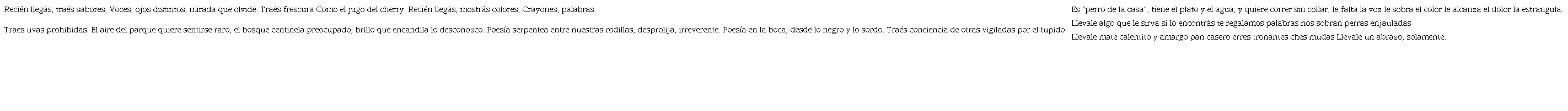 Nos pidió llevar uvas. Como para cualquier movimiento distinto del habitual, pedimos el permiso necesario para ingresar algo que está por fuera del material del taller, y nos encontramos con que la uva era una fruta prohibida en la cárcel. Sin embargo, con previa autorización y la promesa de que estas fueran consumidas íntegramente en el marco del taller, es decir, que no se las llevaran a los pabellones, nos permitieron ingresarlas. Para nuestra sorpresa, la uva generó en las estudiantes una batería de emociones inusitadas, conmovió las estructuras del taller, originó movimientos revitalizantes y desplegó procesos de escritura. Aquella fruta prohibida y anhelada se volvió un objeto de deseo y conquista que inspiró, contuvo, corrompió y desbordó los límites del espacio.