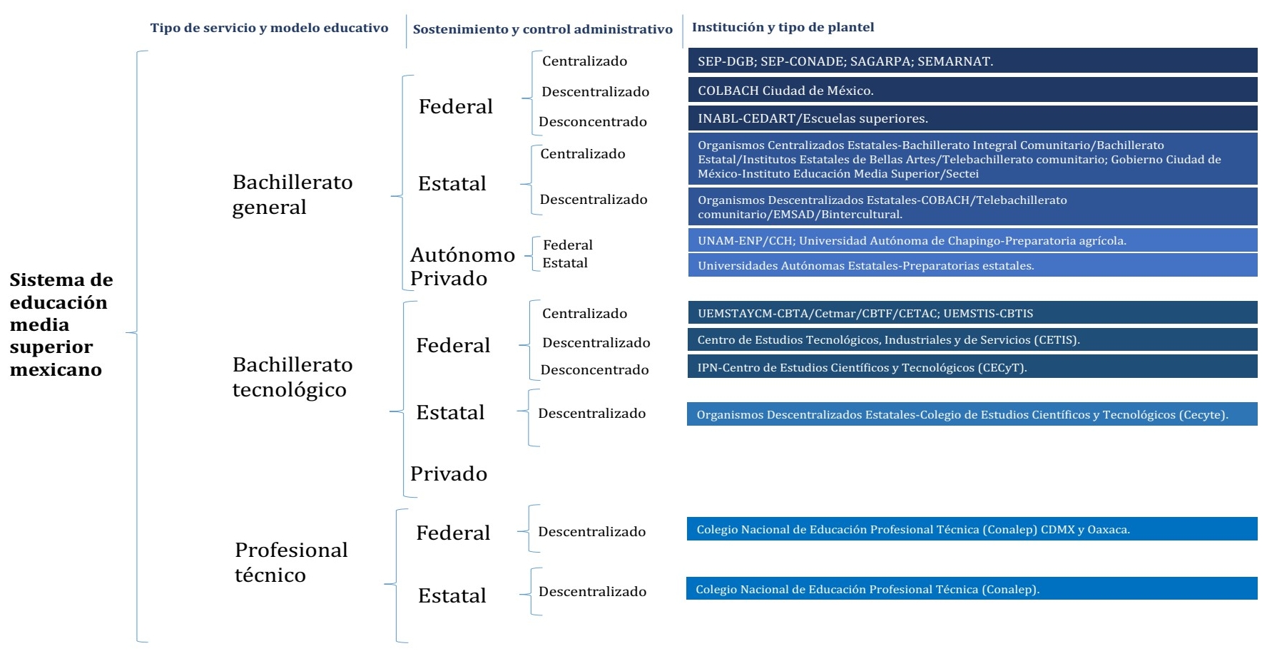 Estos modelos, cuyas características responden tanto a distintas racionalidades pedagógicas como a diferentes formas de organización político-administrativas, se ofrecen en una amplia variedad de instituciones o sistemas que pueden estar bajo distintas opciones de control operativo o formas de sostenimiento; entre ellas, se encuentran las centralizadas y descentralizadas del gobierno federal, las centralizadas y descentralizadas de las entidades federativas, las que dependen de las universidades autónomas federales y estatales, las que son subsidiadas (con financiamiento mixto) o las escuelas privadas, además de la oferta a distancia y de preparatoria abierta (SEP, 2008; INEE, 2018).