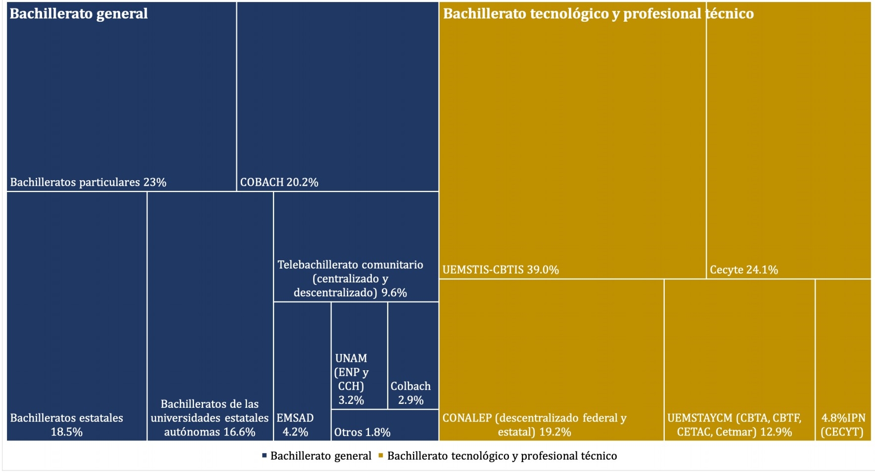 Al analizar cómo se distribuyó la matrícula en cada institución y modelo educativo en el ciclo 2021-2021 se tiene que, en el caso de la Ciudad de México, la institución que tuvo una mayor participación en el porcentaje de estudiantes inscritos es la UNAM. Esto sobre otras instituciones de relevancia, como el Colegio de Bachilleres (Colbach) o el Instituto de Educación Media de la Ciudad de México.