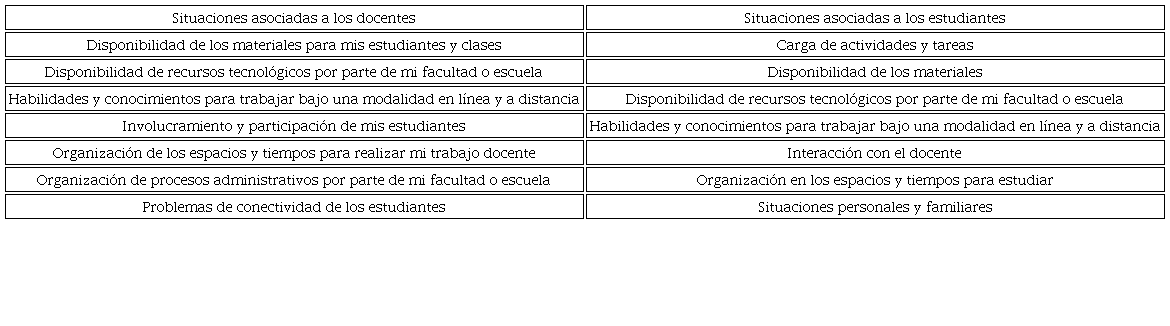 Es pertinente aclarar que el equipo responsable del estudio no definió estas situaciones como problemáticas per se; fueron los propios informantes quienes confirieron esta cualidad a las situaciones que se les presentó en el cuestionario que formó parte de la encuesta. Las situaciones analizadas se relacionan con aspectos como la disponibilidad de materiales y recursos, los conocimientos y habilidades para trabajar en una modalidad a distancia, la interacción docente o los asuntos personales, entre otros.