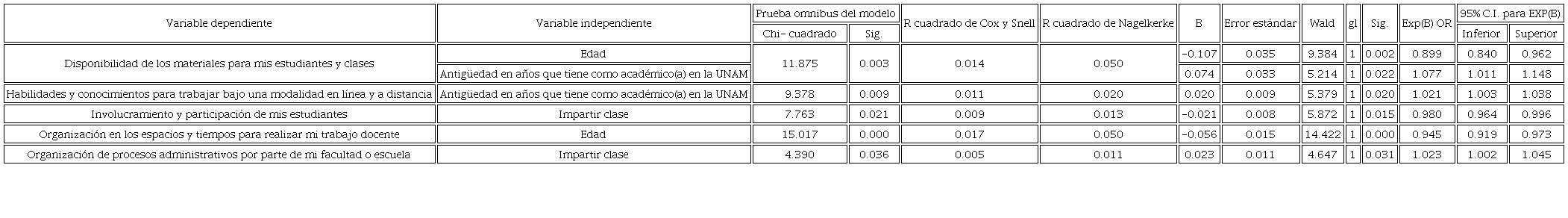 Al realizar el análisis de regresión logística binaria (véase tabla 3), se encontró que, en los docentes, el subsistema (ENP o CCH) no es una variable que ayude a explicar la identificación de ninguna de las situaciones como problemáticas. En contraparte, las variables edad, antigüedad y tiempo que destinan a impartir clase, sí permiten identificar la razón de probabilidad para elegir algunas de estas situaciones como muy problemáticas (prioridad 1), las cuales, si bien tienen un valor de R y de OR relativamente bajos, en todos los casos estos son significativos (p=<0.05). Así, a mayor antigüedad en años como docente de bachillerato, hay un incremento en la probabilidad que los docentes identifiquen la “disponibilidad de materiales para sus estudiantes” y las “habilidades y conocimientos para trabajar en una modalidad en línea” como situaciones problemáticas (prioridad 1).