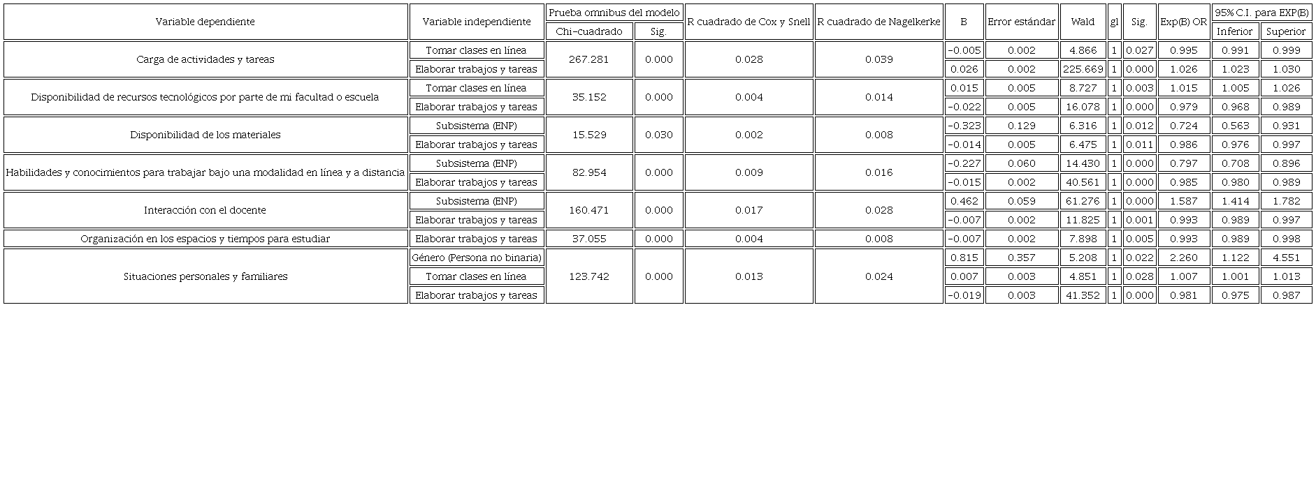 Al respecto, el análisis de regresión logística muestra que, en el caso de los docentes, el subsistema no fue una variable predictiva para seleccionar situaciones problemáticas a diferencia de las variables de edad, antigüedad y tiempo dedicado a dar clases. En el estudiantado, el pertenecer a un subsistema sí tiene un efecto predictivo, aunque moderado, para elegir la “disponibilidad de materiales”, las “habilidades y conocimientos para trabajar bajo una modalidad en línea” y la “interacción docente” como situaciones problemáticas. Destaca también la identidad de género no binaria como la variable con mayor influencia predictiva en el estudiantado para considerar las situaciones familiares y personales como problemáticas.