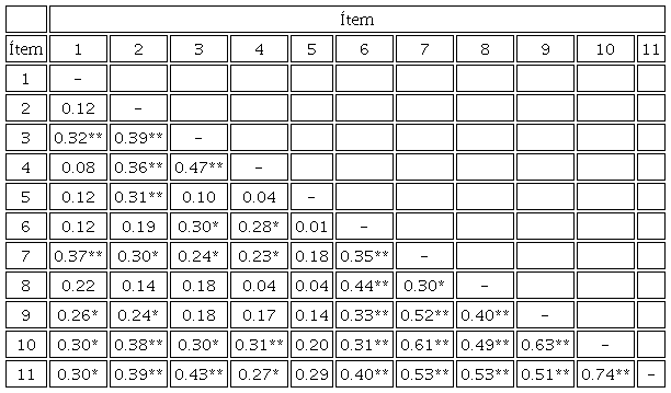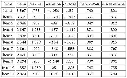 La validación psicométrica comenzó analizando los 11 reactivos iniciales que componen la escala (Tuapanta et al., 2017) y generó estadística descriptiva con medidas de tendencia central (véase tabla 1). Examinando los rangos, confirmamos que todas las opciones de respuesta tuvieron al menos una frecuencia, pero, al analizar la distribución de respuestas por reactivo, constatamos que la mayoría no poseen direccionalidad (Mishra et al., 2019); ahora bien, corrimos pruebas de normalidad a través de los índices de asimetría y curtosis, que reportaron valores por debajo de ± 2.000. Realizamos también una prueba de Shapiro-Wilk, y obtuvimos una p significativa para cada reactivo (p=< .001); de este modo, la totalidad de los reactivos fueron incluidos en el siguiente paso de la validación (Mishra et al., 2019): el análisis factorial exploratorio.