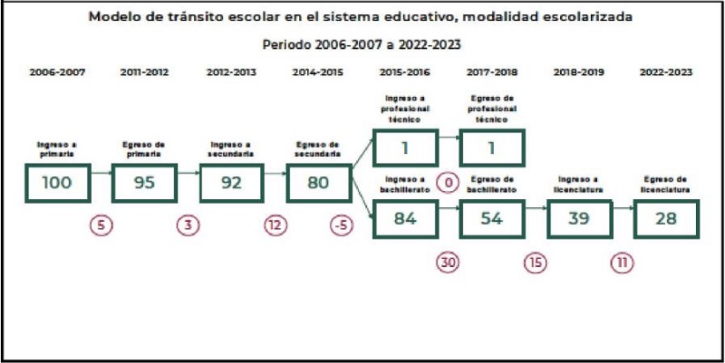 En un entorno desigual es probable que esas nociones de evaluación hayan contribuido a la operación del SEN como sistema de selección natural, debido a que en casi todos los niveles el logro académico depende de elementos que rebasan la competencia de los estudiantes y el trabajo de los agentes educativos. Esto se puede observar en el modelo que estima la transición escolar de cada cien estudiantes en México, pues menos de un tercio de quienes comenzaron la primaria en el ciclo 2006-2007 habrían egresado de la licenciatura en 2022-2023, como se muestra en la figura. En el tránsito entre niveles, un importante segmento de la población en edad escolar va quedando fuera, y los puntos más álgidos son las transiciones entre el ingreso y el egreso de la secundaria, del nivel medio superior y de la licenciatura; las cantidades dentro de los círculos indican el número de personas que abandonaron sus estudios de manera temporal o definitiva.