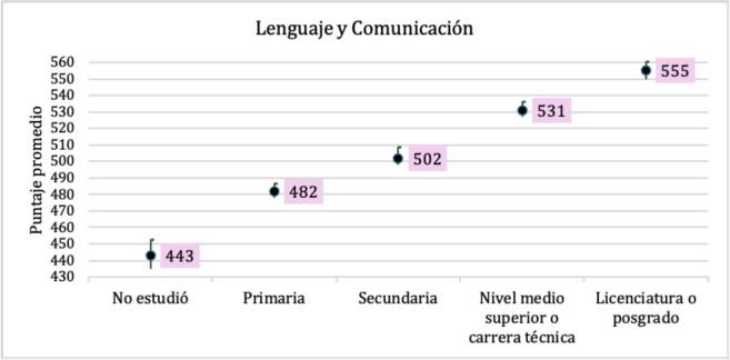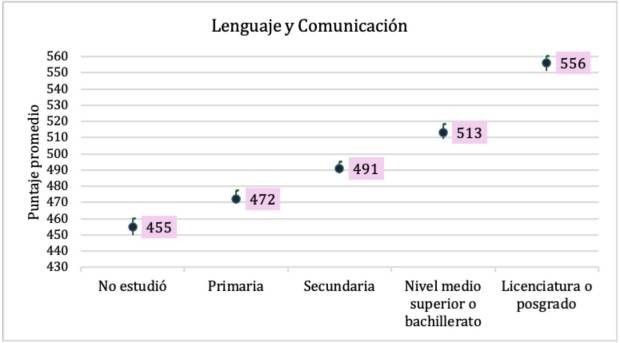 Como apuntamos, este elemento representa la máxima escolaridad alcanzada por los padres y suele ser determinante para el logro. Por ejemplo, en la materia de Lenguaje y comunicación es posible advertir una tendencia incremental de los puntajes promedio en función de esa variable en los resultados de las pruebas de 3º de secundaria. El margen entre los extremos es uno de los más amplios, ya que equivale a 161 puntos de diferencia en los promedios entre quienes tienen padres con escolaridad de estudios superiores o más y quienes declaran que sus padres no estudiaron o que no concluyeron la primaria. La diferencia en puntajes promedio también es importante entre quienes tienen padres con primaria concluida y carrera universitaria o posgrado, en este caso es de más de cien puntos. Esto se puede apreciar en las gráficas siguientes.