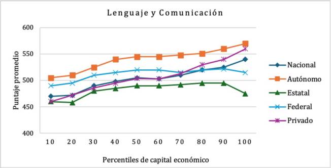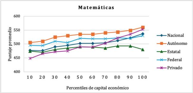 Los resultados de bachillerato o EMS también resaltan el peso del nivel socioeconómico, como se aprecia en las gráficas 5 y 6, compuestas por las dos materias en cuestión. Los puntajes promedio aumentan según el percentil socioeconómico de pertenencia. Otro aspecto relevante y que corrobora lo anterior es el tipo de control administrativo del bachillerato (autónomo, estatal, federal y privado), ya que, como ocurre en los casos de 6º de primaria y 3º de secundaria, los estudiantes de centros escolares que se ubican en zonas rurales y marginales suelen obtener resultados por debajo de la media, 500.