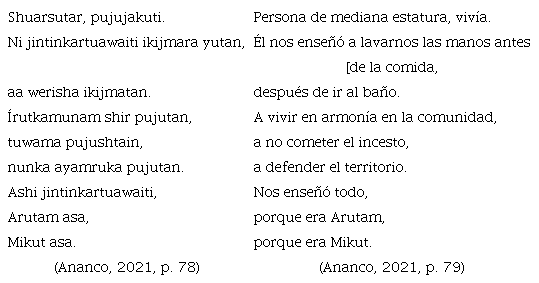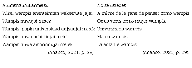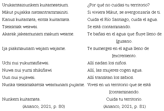 En este sentido, planteamos que el discurso dado por Ananco en sus entrevistas pertenece al lenguaje natural y se proyecta a través de la voz poética en su lenguaje retórico, artístico o poético; es decir, las reflexiones sobre la problemática de la cultura wampís desarrolladas en el lenguaje natural se trasladan al lenguaje literario. Con base en estas consideraciones, a continuación analizamos los poemas “Atumsha urukarmetsu/No sé ustedes” y “Mikut”.