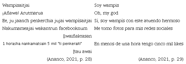 Además, contrasta la referencia al Facebook en la versión wampís con la nominación genérica de “redes sociales” en la versión castellana.
