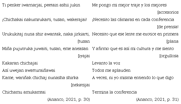 La cuarta estrofa contrasta con la segunda y la tercera, ya que se desarrolla un proceso inverso. Aquí la voz poética cambia los atuendos tradicionales para ponerse su “vestido rojo”, su “collar de oro” y sus “pendientes brillantes”. Nuevamente se hace referencia al lenguaje propio del mundo globalizado, al cual se suma esta vez la red social Instagram: “Nakumamkan Instagramnum iwaiñajai/Me tomo fotos y publico en mi Instagram”. Esto nos permite plantear la doble identidad de la voz poética, cuyo desplazamiento cultural se representa mediante la vestimenta y sus constantes cambios.