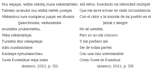 Como observamos, se destaca más la forma de representar y articular los cantos tradicionales wampís en los poemas, e incluso se identifica la presencia de la cultura awajún que se entremezcla con la wampís en lo que podríamos entender como el diálogo intercultural entre estas culturas bastante cercanas, cuyo resultado es la presencia de una voz poética wampís-awajún. Esta cuestión es relevante si consideramos que la autora es portadora de los saberes ancestrales de ambas culturas debido a que nació en una comunidad awajún y se crio en una comunidad wampís, a la cual pertenece su familia materna. Asimismo, los autores mencionan que las formas tradicionales wampís-awajún coexisten en la poesía de Ananco con las formas aprendidas en la tradición occidental, de manera que Sanchiu se configura como un espacio de encuentro entre las culturas wampís, awajún y occidental, que definen la identidad de la autora y de la voz poética.