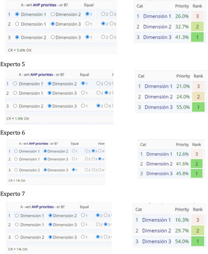 Se utiliza la escala de Saaty, tal como se describe en la tabla 3, de acuerdo con la metodología propuesta por Penadés (2017). En la figura 2 se presentan las matrices de comparaciones pareadas elaboradas por cada experto, así como los vectores de preferencias correspondientes para los expertos del 1 al 7, como ejemplo representativo del proceso de votación realizado por todos los participantes.