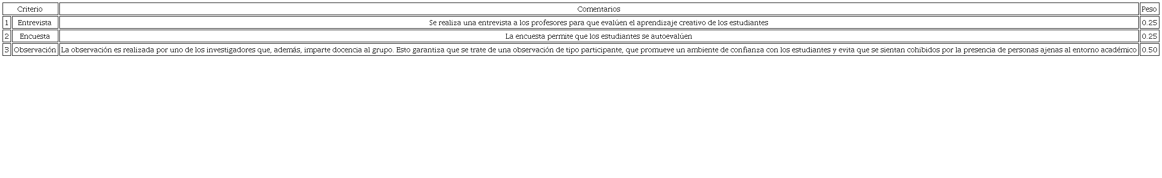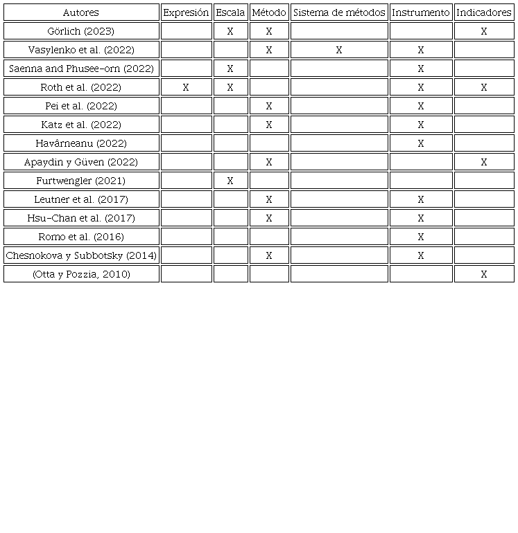 Por otro lado, las otras investigaciones citadas en la tabla 1 hacen referencia a instrumentos como el test de Torrance (Said-Metwaly et al., 2021) o herramientas desarrolladas por los propios investigadores. Sin embargo, estos trabajos no presentan metodologías que midan la creatividad de manera general y aplicable a diferentes situaciones, dimensiones e indicadores de forma cuantitativa.