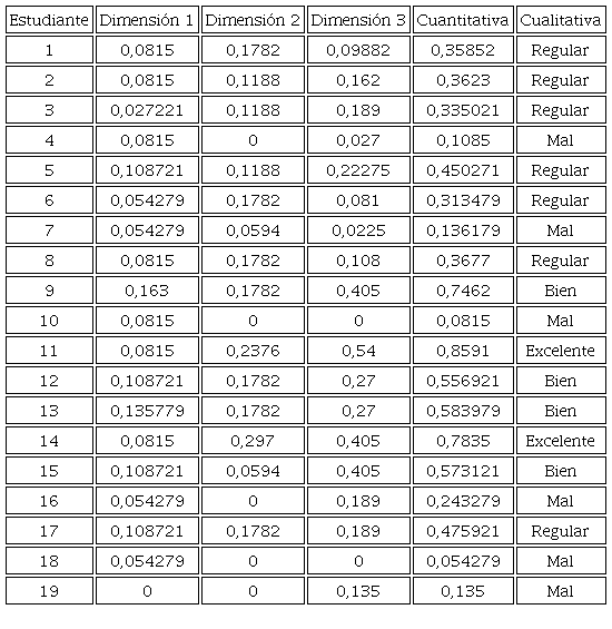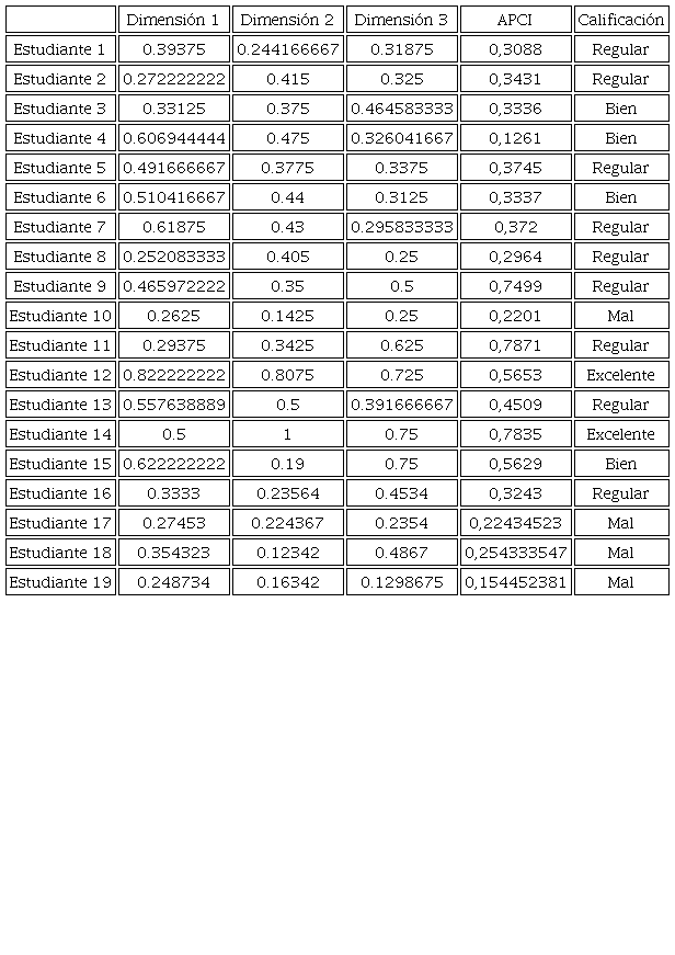 Del análisis de la tabla, podemos inferir que las evaluaciones más bajas correspondieron a la dimensión tres. Al dividir los valores obtenidos por el peso de esta dimensión, obtuvimos un resultado significativamente inferior al de las dos primeras dimensiones. Esto indica que los estudiantes presentaron mayores deficiencias en la dimensión tres, considerada por los expertos como la más importante para el aprendizaje creativo. De los 19 estudiantes evaluados, solo tres mostraron indicadores en esta dimensión que permiten afirmar que generan ideas propias y nuevas en el ámbito de la informática.