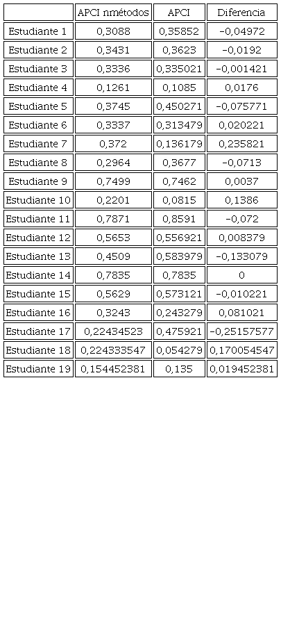 El cálculo de la diferencia entre los resultados obtenidos mediante los tres métodos y la encuesta se realizó restando el primer valor del segundo. Los resultados muestran que solo dos estudiantes superan el intervalo previsto, lo que indica que las desviaciones significativas entre una evaluación y otra son escasas.