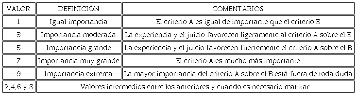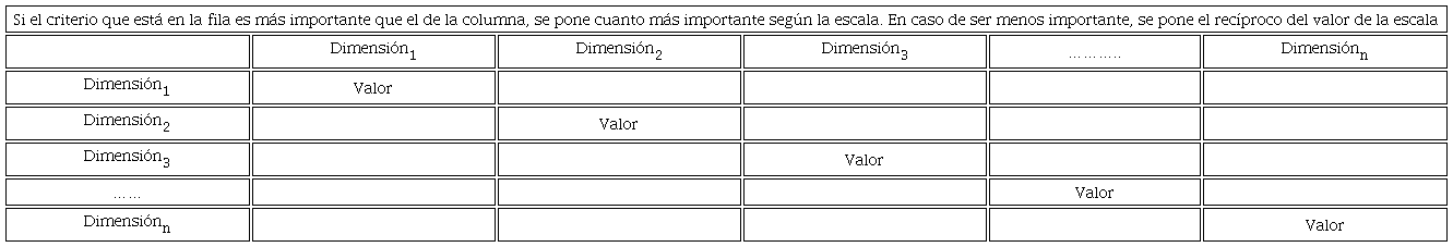 Para determinar el peso relativo de cada dimensión, se recomienda emplear el método de comparaciones pareadas, aunque se clasifica dentro de los métodos de ponderación subjetivos (Martínez et al., 2018). Este método permite que los especialistas o expertos consultados expresen sus preferencias entre los criterios evaluados, y cuantifiquen la intensidad de dichas preferencias mediante la escala de valoración propuesta por Saaty (1987).