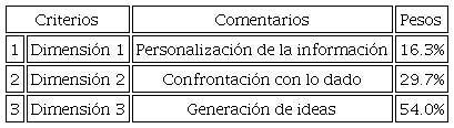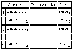 En la tabla 2 se presenta la propuesta de consulta a los expertos para determinar el peso relativo de las dimensiones. Los expertos deben completar las casillas en blanco según el orden establecido en la primera fila de la tabla, utilizando la escala de valoración mostrada en la figura 2.