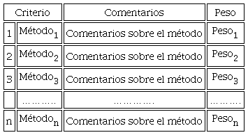 donde Pj es el valor del peso de cada método cuya suma sea igual a 1, Cij es el valor del criterio de medida y m es la cantidad de métodos aplicados.