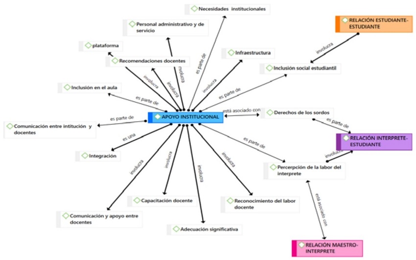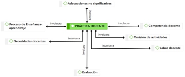 La información recopilada se organizó en las categorías de práctica docente, relación maestro-estudiante y apoyo institucional. Al final de cada una, incluimos una red semántica que elaboramos para visualizar las conexiones entre los códigos o conceptos identificados, que fueron útiles en el análisis.