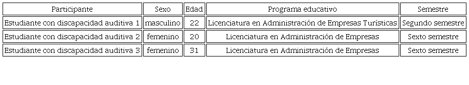 Estudiantes con discapacidad auditiva: hombres y mujeres de entre 20 y 26 años, pertenecientes a distintas carreras de la Universidad Estatal de Sonora.